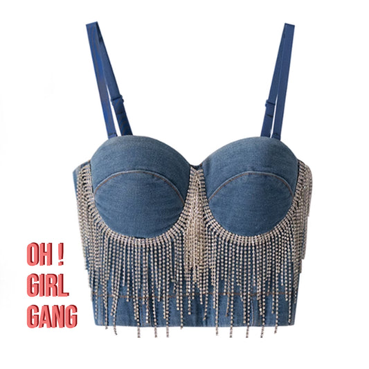 Rhinestone Fringe Denim Bustier