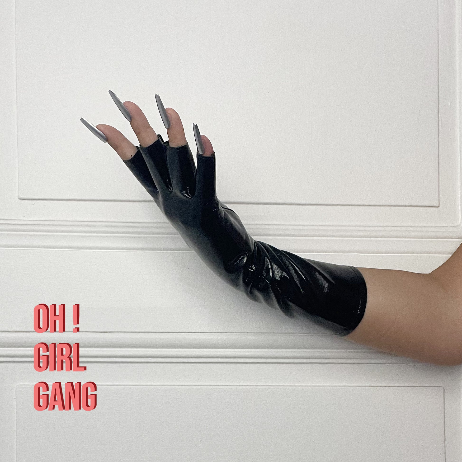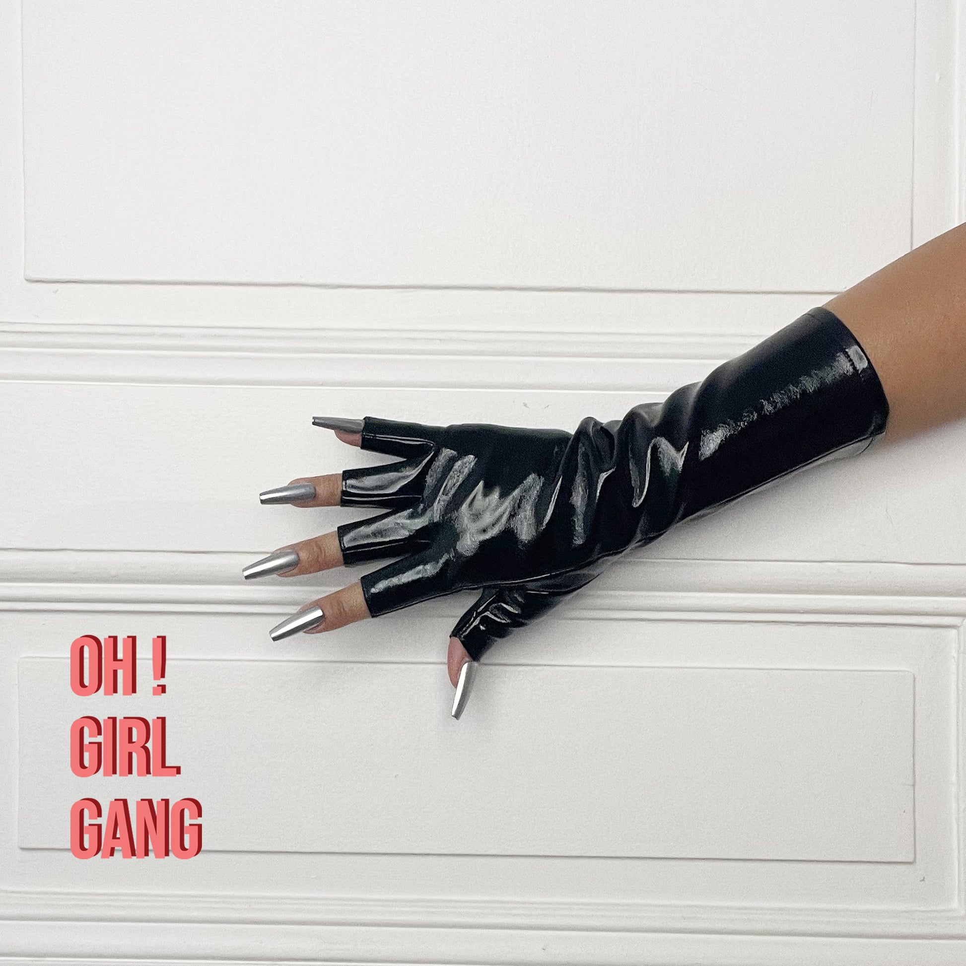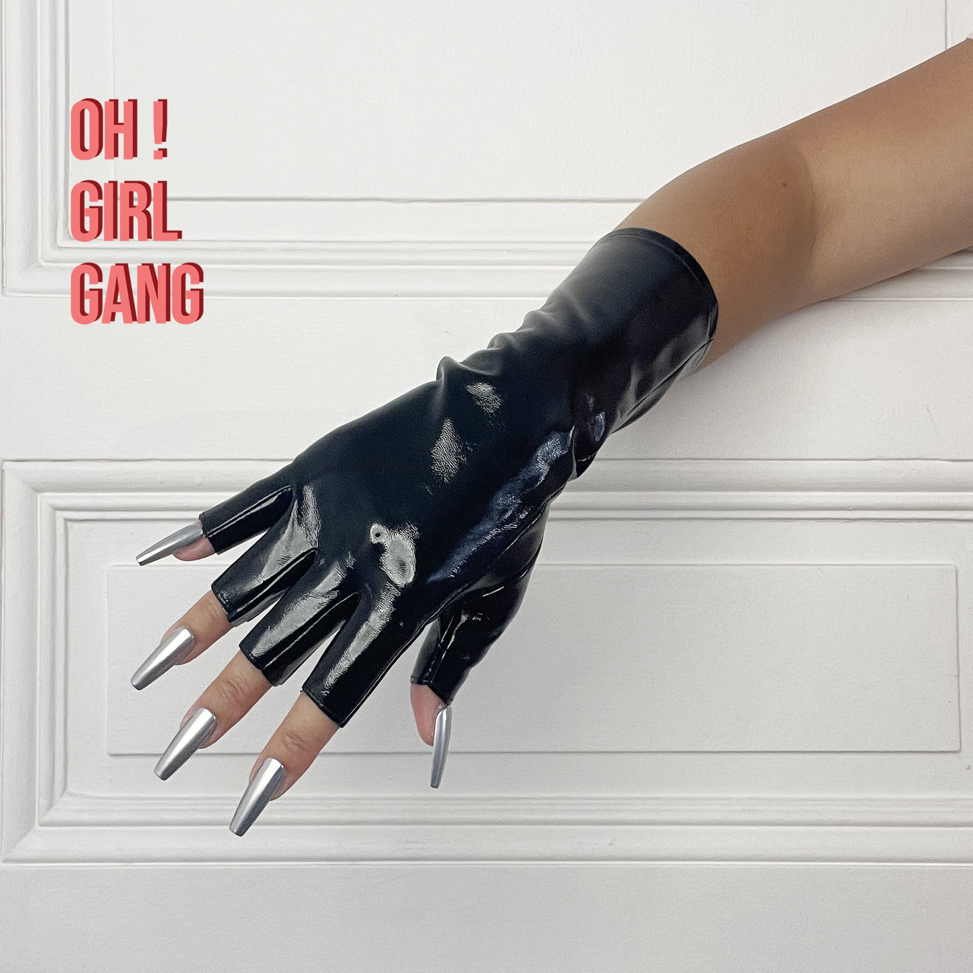 Hot Red Patent Leather Fingerless Gloves, Black Faux Leather Half Finger gloves. Cyber futuristic, Drag Queen, Stage, Festival Party gloves.